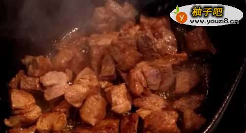 5准备一个至少3公升的锅子,放入一些油(例如: 蔬菜油、橄榄油、无水奶油…)。热锅后,将肉块放入锅内,并加入一茶匙的香料。翻炒至肉表皮为焦糖色后,将肉取出,先放在一旁。因为锅底受热面积较小,建议肉块分2~3次炒,比较容易炒成焦糖色(梅纳反应)。
