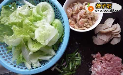 准备食材,我做的是两人份的,用一斤粿条,青菜可根据自己喜好添加,瘦肉,肉卷,虾仁,配料可以自己选择的;