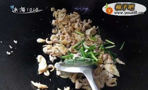 4下葱段,炒香,下青菜,炒均匀;