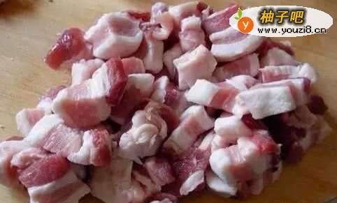 33.把沥干的水份的糯米与切成肉丁的五花肉拌匀,加入适量生抽与老抽酱油,老抽只要一点点为配色用。