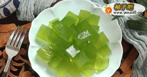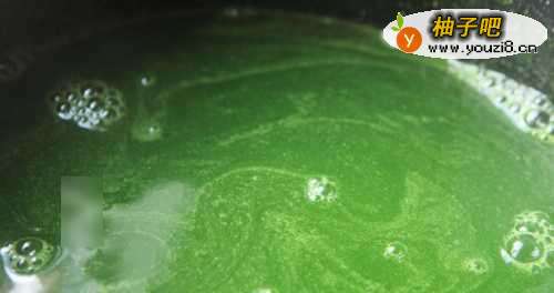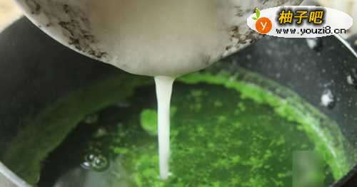 6边倒白凉粉边搅拌,等锅内的水再次沸腾后,凉粉水和黄瓜汁融合成这样碧绿的透明状就可以关火了;