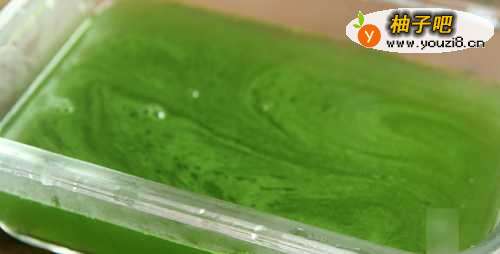 7把做好的黄瓜汁倒入玻璃容器内,让汤汁自然冷却2小时,冷却好后,整体就像果冻一样非常Q弹,这样我们的黄瓜凉粉就做好了。