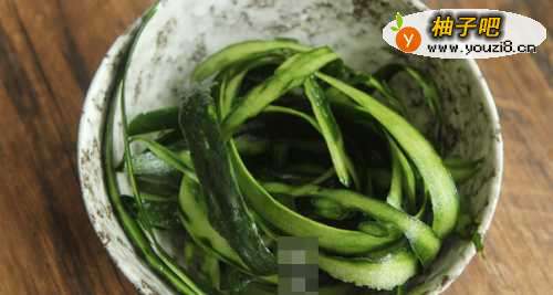 黄瓜用盐水搓洗干净,将黄瓜皮削下来,剩下的黄瓜肉可做个凉拌小菜,而黄瓜皮就不要扔了哦,它是这道小吃的主要材料。
