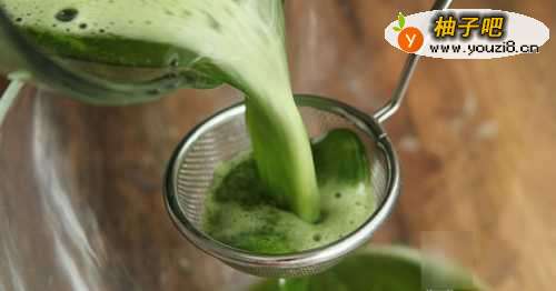 3黄瓜汁打完之后,要过滤一次,就是把黄瓜汁过滤掉渣沥出来,这一步很重要哦,这样做出来的黄瓜凉粉口感会更加的细腻;