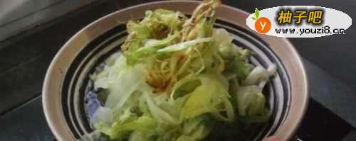 3这时候,等葱变焦黄后,我们捞出,放入在生菜上;