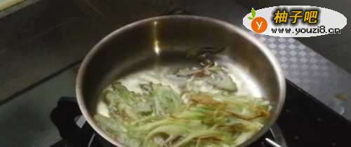 2然后,另起锅倒油,放入已经切好的葱丝,用小火慢慢煸成焦黄色;