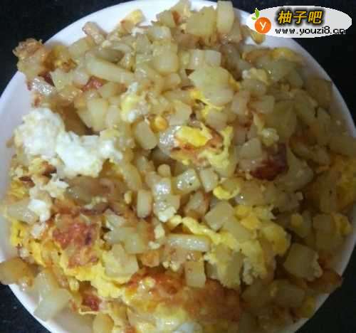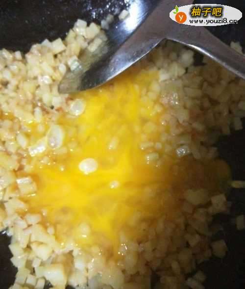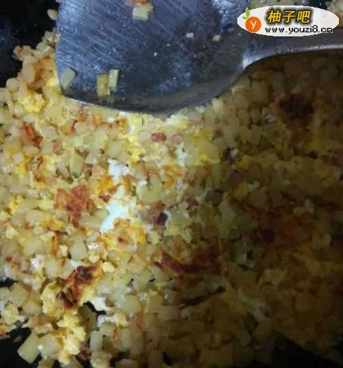 5待土豆炒软至8成熟以上时,倒入打好的蛋液。