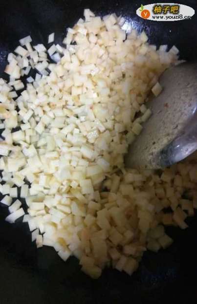 4待姜、蒜爆出香味后,放入切好的土豆丁丁,翻炒使之受热均匀。