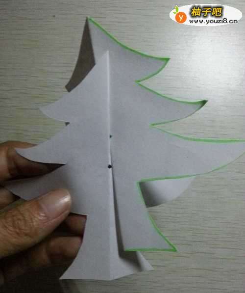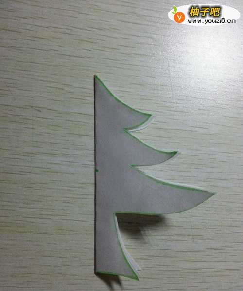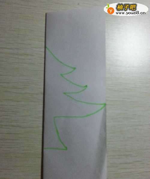 2用笔按照如图所示画出圣诞树。画的时候要选择纸张的边缘,否则剪出来的树不是两个完整的,如图。