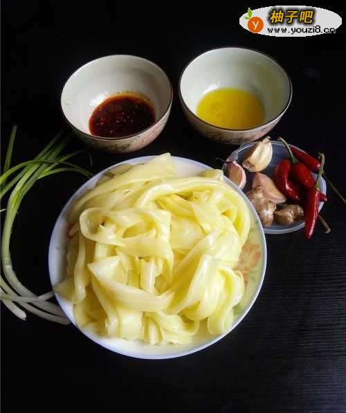 备好食材:河粉,老姜,大蒜,小米辣,小葱,红油辣子,有机亚麻仔油。