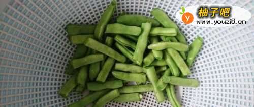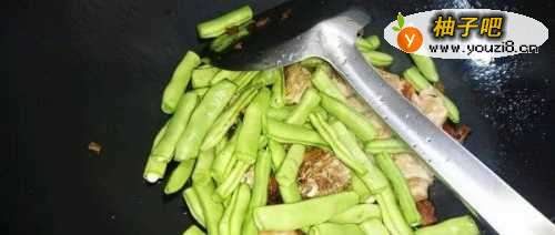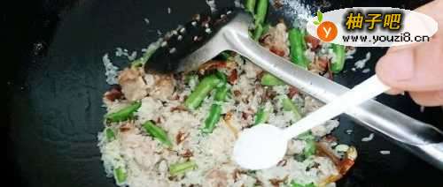 5下入四季豆翻炒片刻,倒入淘洗好的大米。
