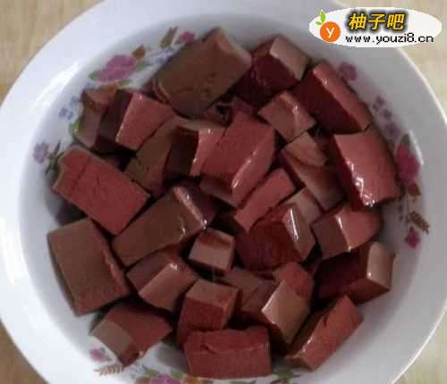 鸭血冲洗下表面,切成块,泡入水中20分钟左右。