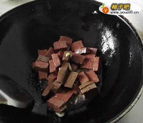4加入鸭血翻炒,然后加入盐,料酒翻炒。