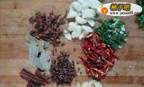3切好葱、姜、蒜、辣椒、姜,准备好香叶、花椒、八角、桂皮。