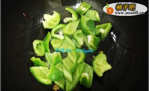 5先加入青椒薄片翻炒一会,有五六分熟后加入鸭胗片,混合翻炒一会。