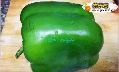 准备一个新鲜的青椒,将其清洗干净,对半切开,然后剜去蒂头部分,掏去籽料,然后切成薄片状。