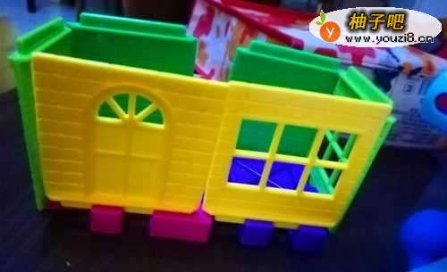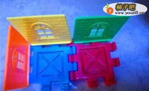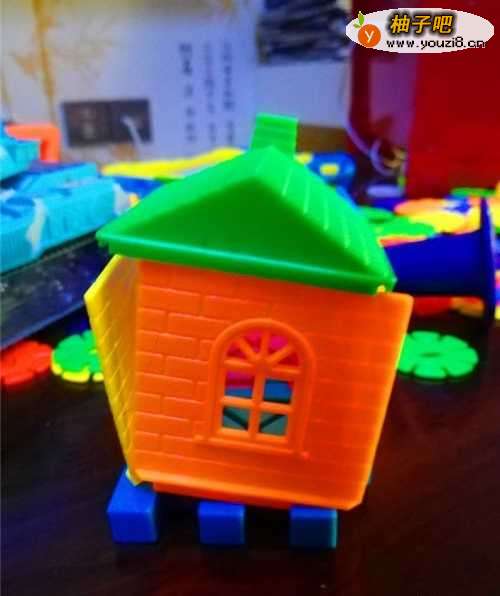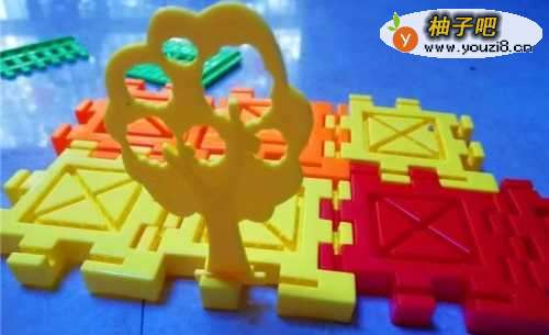 2拼装1,把小树拼接在塑料积木上,接口处对好。小树栽在院子里了。