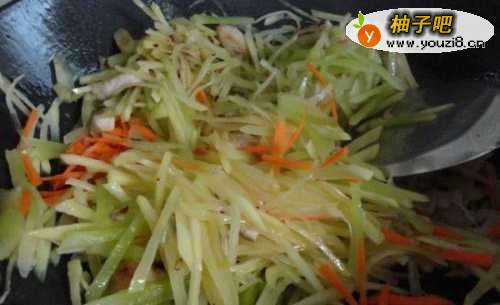 7土豆断生后加入笋丝和胡萝卜丝,继续翻炒