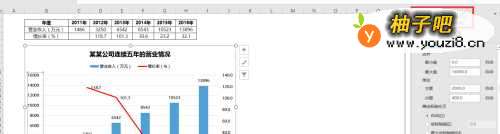 5然后调整图表横纵坐标轴区间,点击选中纵坐标标签,右击鼠标,选择【设置数据坐标轴格式】,在excel右边弹出【设置坐标轴格式】对话框。如下图所示: