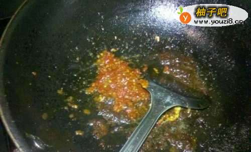 3热锅冷油,油温6成热,放入豆瓣酱,大蒜爆香