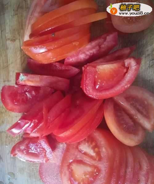 将西红柿洗净,去掉尾巴,如果讲究,可以用刀均匀割开小口子,放入温水中煮一会儿,然后很轻松的把皮剥掉,但我相信,很多年轻人懒得这么弄了。然后切成片,大小按自己的喜好。
