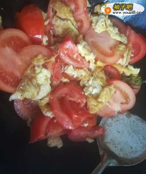 4在鸡蛋中撒一点盐,翻炒几下,待鸡蛋变成金黄色后,倒入切好的番茄,如图所示,翻炒几下。