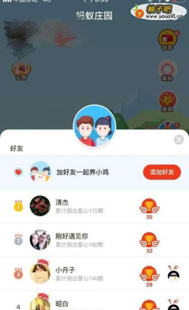 2屏幕下方左边有个好友,里面可以看到别的好友的小鸡,其中会有小鸡过来吃食,可以通知好友驱赶能赢得饲料