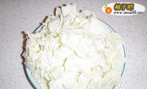 2将白菜去掉外帮洗净,直剖成两瓣,切成寸半长的段,然后再直切成二分宽的粗丝。