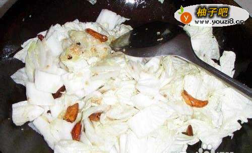 8放姜、蒜、辣椒后放入白菜翻炒