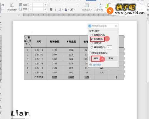 4在弹出的“表格转换成文本”对话框中,选择文字分隔符【制表符】,点击【确定】即可。