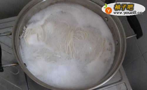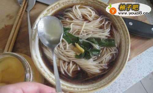 7将面条装入碗中,加入汤汁,再加入一勺荤油,加盐和鸡粉