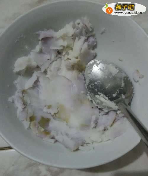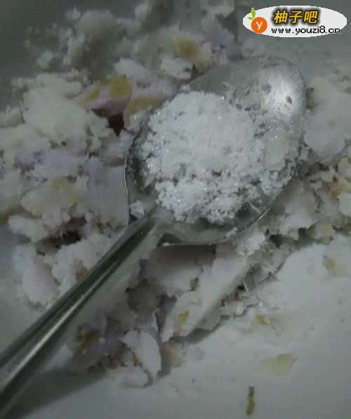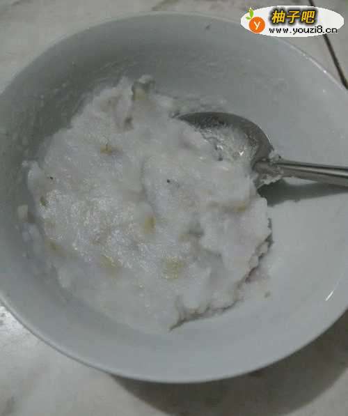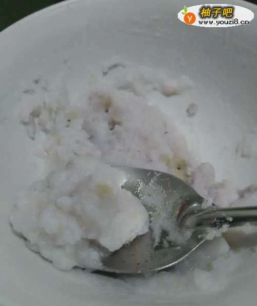 4用勺背将山药碾碎,弄成面状。