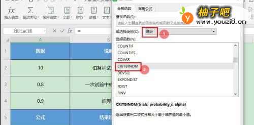 3在“插入函数”窗口中,选择函数类别【统计】—【CRITBINOM】,点击【确定】;
