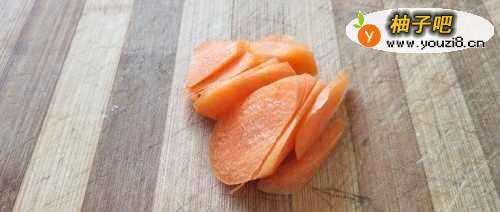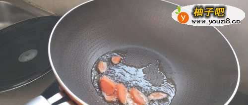 3如图,加入切好的胡萝卜片,翻炒两下。