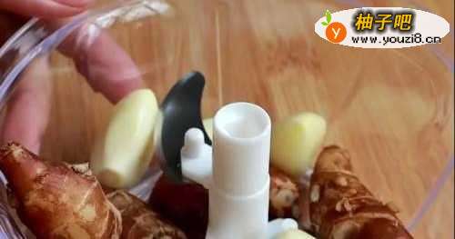 首先我们把买回来的沙姜清洗干净,然后和蒜瓣一同放入搅碎机中打制成碎末。