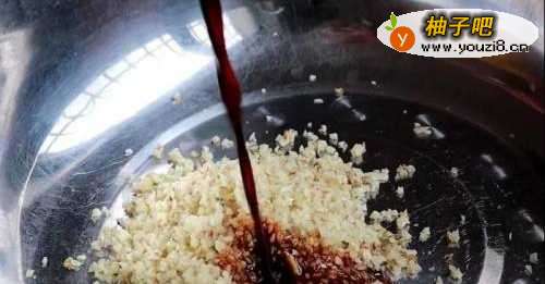 2之后准备一个大一点的盆儿,在盆中加入沙姜蒜末,一勺甜面酱,2勺蚝油,半勺生抽,半勺老抽,一勺料酒,1克盐,1克鸡精,用筷子不停搅拌均匀备用。