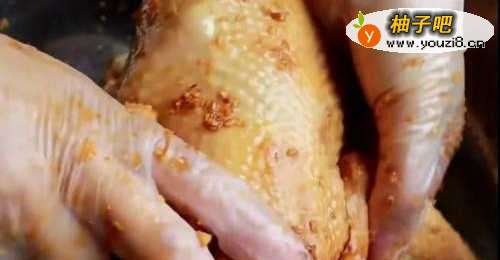 3把新鲜的土鸡适当清洗干净,用吸水纸吸干表皮的水分之后,放入准备好的沙姜调味料中,戴上一次性手套,把调味料抹制在土鸡的外表和内里,放在冰箱冷藏腌制三小时。