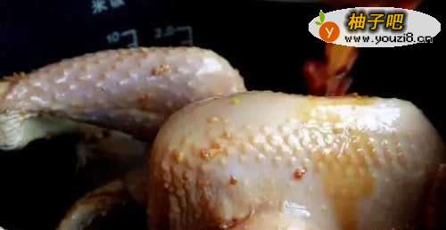 4准备平时煮饭的电饭煲,先在锅底铺上香葱段,再把腌制好的土鸡放入其中,浇淋上腌制的调味汁,盖上盖按照正常的煮饭模式煮制即可食用。