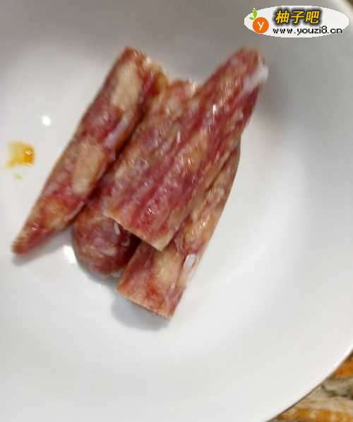 10板栗和芋头都快煮熟的时候,放入腊肠