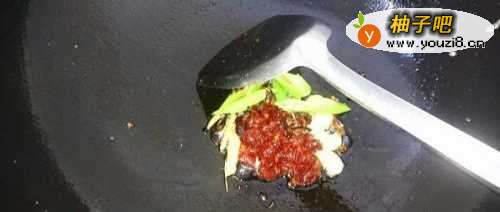 4锅中留少许底油,依次放入花椒,干辣椒,葱姜蒜煸出香味,再倒入1汤匙豆瓣酱炒出红油。