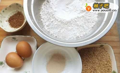 2面粉加油、盐、花椒粉、芝麻、鸡蛋混合,酵母加少许水化开加在面粉里面