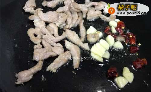 5瘦肉炒到四五成熟的时候,把干辣椒和大蒜一起放入锅里爆炒出香味。