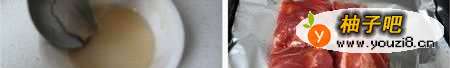 4玻璃碗内剩余的叉烧汁倒入肉块中,接着调匀的蜂蜜水淋入肉的表面上