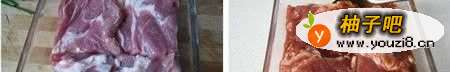 准备材料,梅花肉洗净切成四小块,我切的是四方块,正好放入玻璃碗中