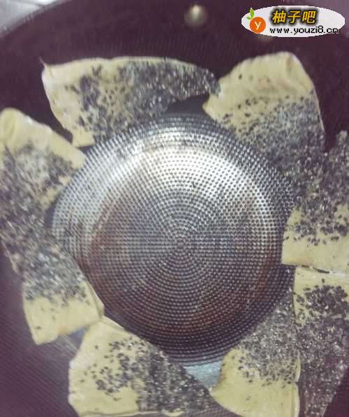 4再把它分成小团,用檊面杖,把它檊成圆状,这时上面撒上黑芝麻。再用檊面杖把黑芝麻压入到薄面里。