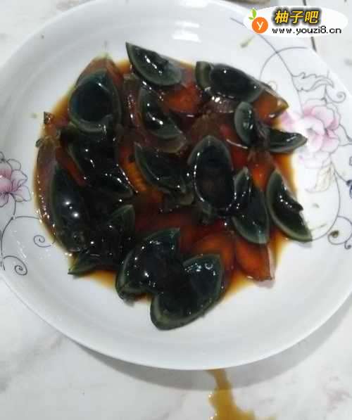 6先将多一些的醋倒在皮蛋上,这样皮蛋的味道更好。