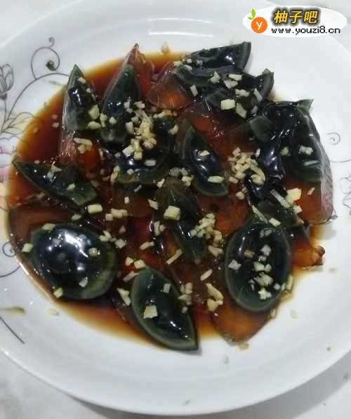 9在皮蛋上面再倒上少许香油,吃的时候,用筷子拌匀,就可以吃了,酸酸的、香香的,特别好吃。