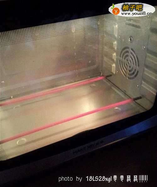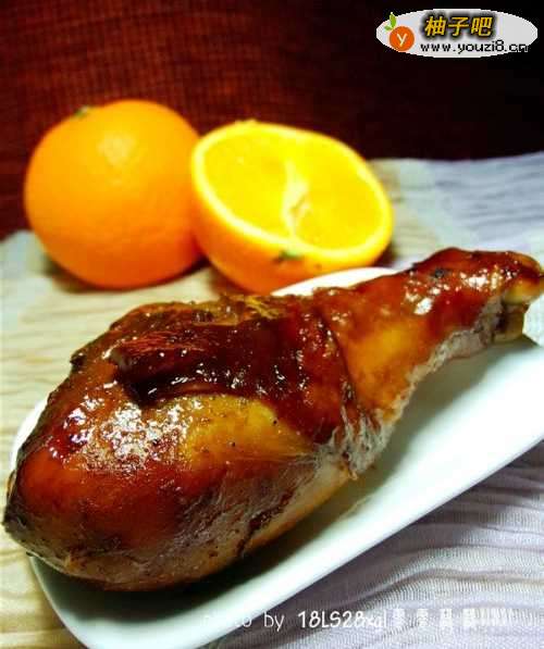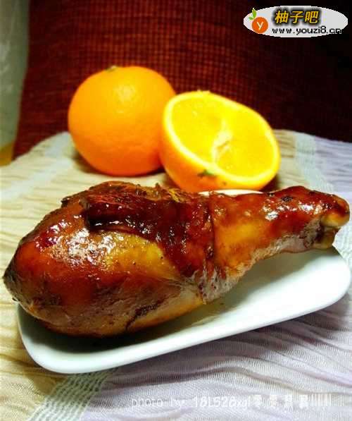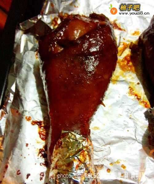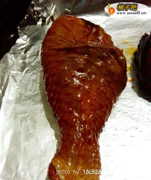 11烤箱预热后,将烤盘放在烤箱中层,上下火烤20分钟,然后将烤盘端出来,给鸡腿翻面,再刷一层料汁;