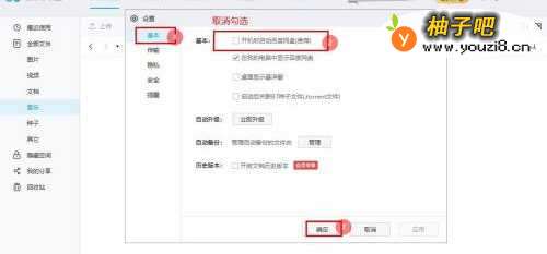 4在“基本”设置界面,取消勾选【开机时启动百度网盘】,点击【确定】即可。