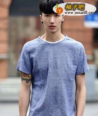 4潮流男装搭配四,浅蓝色的圆领短袖上衣,有着牛仔布的时尚特点,散发着随性气质,它的低调风格,非常适合男人的成熟气质,最后搭配黑色休闲裤,能够瞬间让男生的整体魅力表现得淋漓尽致。
